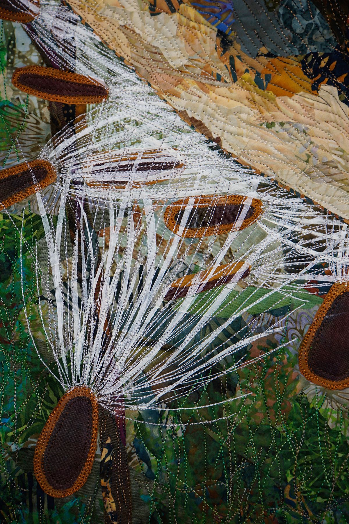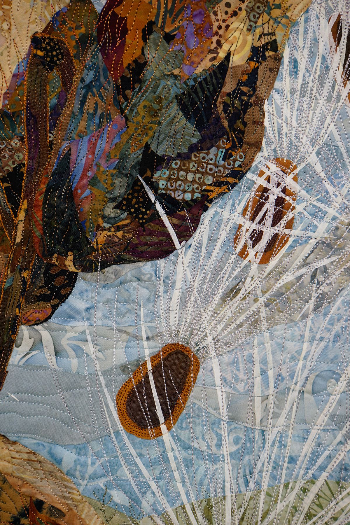 Milkweed, No. 2 was made to be entered into and was, I am happy to say, juried in to Brenda Gael Smith's A Matter of Time exhibit which will debut in Sydney, Australia in March 2016. You can learn more about the exhibit here. The pieces were all to be 40 cm wide by 100 cm long, or about 15 3/4" wide by 39 inches long. The second in a series, this piece features my signature fabric collage and heavy quilting. Materials and Techniques: Artist-dyed and commercial cottons, wool-poly blend batting, polyester thread, textile paint, Mistyfuse adhesive web. Hand-dyeing, collage, stenciling, screen-printing, free-motion quilting. Size: 15 3/4" wide by 39 inches tall In The Collection of Frank Klein.